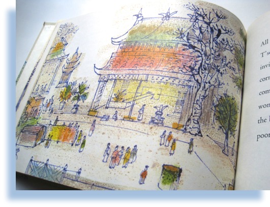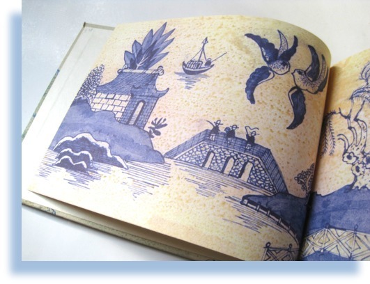 Aren't the illustrations charming? The style is different from the other "Legend of the Blue Willow Plate" stories I have seen, and the story is different as well. In this one, a mandarin's daughter, Koong-se, falls in love with a handsome but poor young clerk named Chang. Her father finds out of their involvement and orders Chang to flee, then he imprisons his daughter in a nearby pavilion so he can keep watch over her. The mandarin, seeking a suitable husband for his daughter, chooses a powerful mandarin named Ta-jin, and the marriage is arranged. As luck would have it for the love-stricken young lady, a coconut-shell boat (think "message in a bottle") arrives from Chang, who still loves Koong-se. She writes back and explains about the arranged marriage, and Chang shows up in disguise just before the wedding and runs off with Koong-se. They set up housekeeping on a small island, but alas, the spurned suitor finds out about all this and sends soldiers to kill Chang. Poor Koong-se sets fire to the house she'd holed up in and goes up in flames. Chang and Koong-se are then turned into doves by a goddess and finally get their happily-ever-after ending.