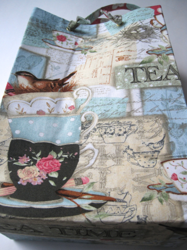Recently I mentioned that I had received a lovely gift bag as a thank-you gift for being a judge for the hat contest at the Senoia Area Historical Society's spring tea. I got to select from three fabric gift bags, all with lovely tea-themed prints, and I immediately chose this one with the teacups, handwriting, and aqua blue fabric. It was calling my name!