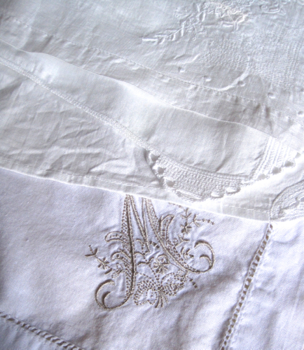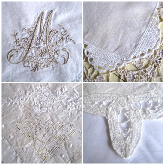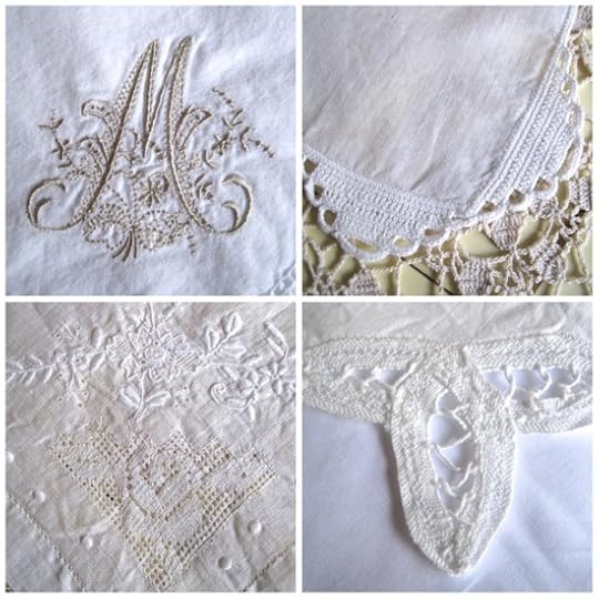 I discovered that while I had lots of mismatched floral napkins in various pastels, the ones I ended up using almost every time I have a tea or other formal occasion are the dressier white ones, and they basically ended up being various white napkins with pretty corner treatments, clockwise from top left: monogrammed "M" napkins (which I love but found only four of them a few years ago), crochet-edge napkins (a find from my late mother), Battenberg lace napkins (also from my mom), and some thin but beautiful embroidered and pulled-thread napkins (I have no idea where or when I found these).