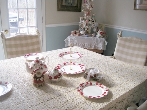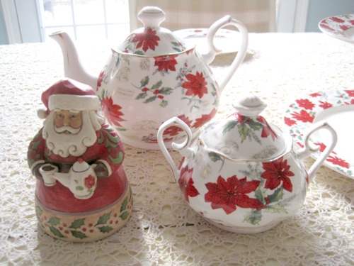 What do you do when you're missing a creamer? You substitute a cute Santa Claus tea figurine (thank you, Linda!), that's what! He's filling in admirably, I think, in light of the missing piece that I was unsuccessful at locating in 2016, so I'm hoping for better luck with the search in 2017.