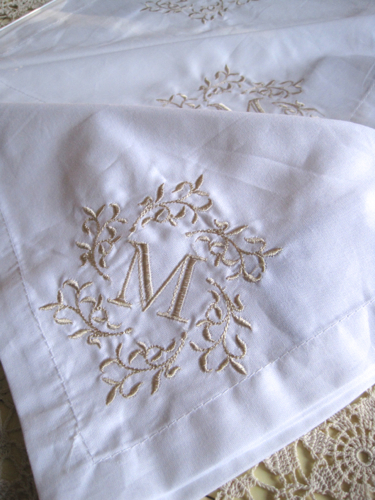Happily, my gift from Aunt Jane this Christmas was a set of six more monogrammed napkins, which, surprisingly, were found at T.J. Maxx! I was intrigued to note the differences in the whiteness level of all of my napkins, and I realized since I usually use them with a cream-colored crochet tablecloth, I mix white and cream things quite regularly and don't really worry about whether or not something is a stark white. My only remaining question is what's the best way to store napkins. I usually wait and iron them right before I need them, but I'm thinking of going ahead and ironing them and rolling them around an empty gift wrap roll. Would love to hear any tips/thoughts you might have to share!