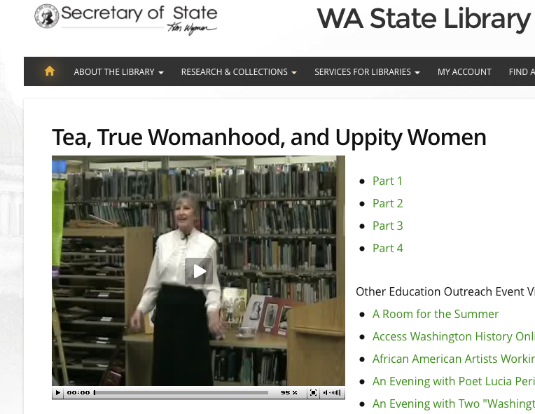 • Are you a fan of women's history? If so, you might enjoy watching the video of Susan Butruille's 2007 (I think) lecture at the Washington State Library, "Tea, True Womanhood, and Uppity Women." I liked this quote of hers at the beginning of the lecture: "Historically, when women have gotten together over tea, radical things happened." (Hint: The lecture, which is divided into four different segments and totals about an hour, is accessible here. If you want to skip all the welcome remarks, start at about the 6:30 point on Part 1.)