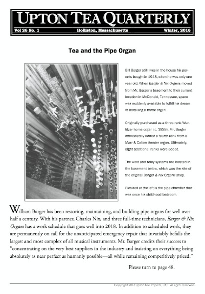 The discussion of good music was a welcome subject and took me back to all those enjoyable Music Appreciation classes in college. I found the article a departure from the usual feature story in the Upton Tea Quarterly, but I quite enjoyed reading about quality organs and quality tea! If you'd like to read the article for yourself, click here.
