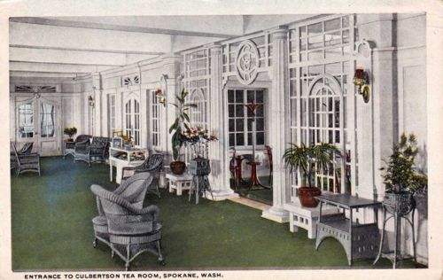 • The Culbertson Tea Room in Spokane, Washington, was the place to dine for ladies shopping at Culbertson's Department Store. I don't really know much about Culbertson's, and an article in the Spokesman-Review said only that "Culbertson’s, which carried everything from furniture to groceries, was deep in debt when the Depression hit and went into bankruptcy in 1930." That may be, but the place sure looked swell at the time this postcard was sent in 1919, didn't it? The sender of the postcard called this tearoom the "best place in the city to eat."
