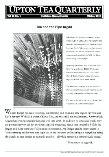 You just never know what you'll find featured in the new Upton Tea Quarterly. The Winter issue landed in my mailbox this week, and I was intrigued by the title "Tea and the Pipe Organ." I couldn't help thinking of my tea-lover friend Joy, who is a church organist, when I saw this article.The piece tells about a man who has been restoring, maintaining, and building pipe organs for more than 50 years and how his business became a success by focusing on quality. It also discusses the quest for "concert hall sound" in a home sound system, all of which I found intriguing, but I kept thinking, "What does this have to do with tea?" The writer—and there's no byline on the article, so it's unclear who that is—soon got to it with this: "Besides the freedom to enjoy music at any time of day, a home sound system accommodates personal preferences that are impractical with most public performances. For the writer, that personal preference includes the combined tea and music experience."