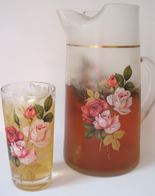 • West Virginia was home to a number of glass companies during the glass boom of 1900-1940, including the West Virginia Glass Specialty Company, maker of this tea pitcher and glass set with an iridescent rose design. Most of us own a tea pitcher or two, and if you're interested in looking up some info on the great glass makers of yesteryear, a good site to visit is here, the Museum of American Glass in West Virginia.