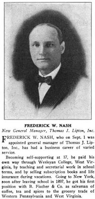 • In 1920, a West Virginia man became the new general manager of Thomas J. Lipton, Inc. in the US. According to the book "Coffee and Tea Industries and the Flavor Field, Volume 43," Frederick W. Nash, who became the general manager on Sept. 1, was a man who, "becoming self-supporting at 17 … paid his own way through Wesleyan College, West Virginia, by teaching and secretarial work in school terms, and by selling subscription books and life insurance during vacations. Going to New York, soon after leaving school in 1897, he got his first position with B. Fischer & Co. as salesman of coffee, tea and spices to the grocery trade of Western Pennsylvania and West Virginia." Nash had also served in the Philippines with the Fourth U.S. Cavalry and helped organize the American public school system there.