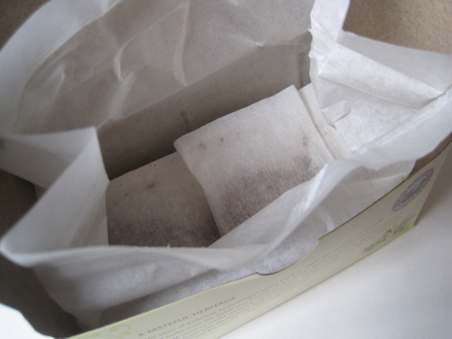 I always hope that one day, I'll peek into a box of Celestial Seasonings and find that they've packaged the tea bags individually. But here they are again in a stack of twos. (Why are they in twos, friends? Why? I always wonder.) Such yummy teas, though.