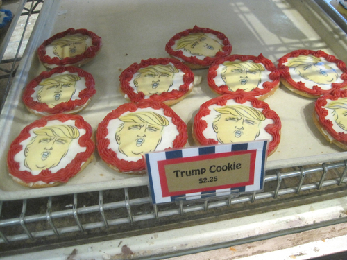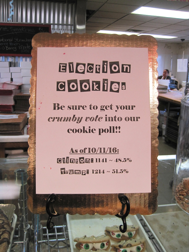 And I trust I can safely share this here without inciting a political riot, but I was amused that they sell cookies with the likenesses of both Hillary Clinton and Donald Trump. The sign on the counter, which was already a week old when I was there, reported "Clinton 48.5 percent, Trump 51.5 percent." (But in fairness, I have to tell you that I saw far more Clinton yard signs than Trump ones as we drove around Green Bay, though I always wonder whether such signage indicates actual voting patterns, especially in an election year as bizarre as this one has been.)