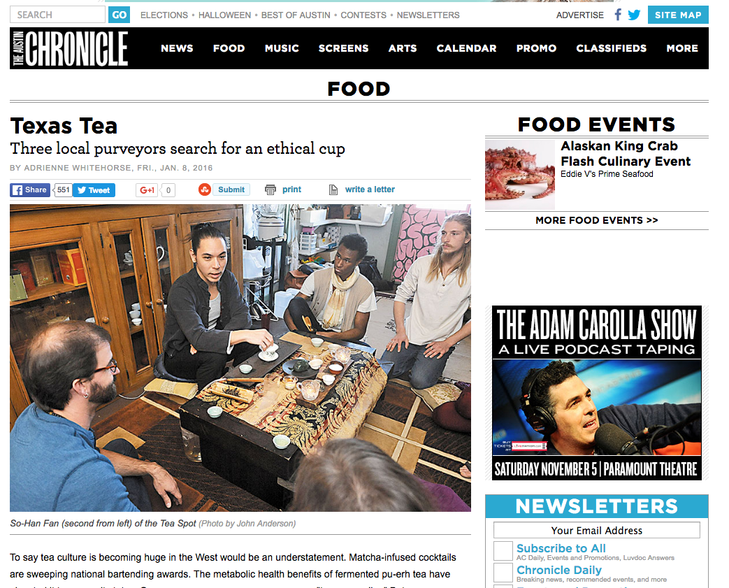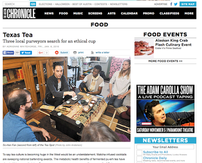 • "Texas Tea" is also the name of a January piece in the Austin Chronicle online (screen grab shown above) that explored the efforts of three local tea purveyors to source quality teas. The line that most intrigued me was this: "For those interested in a sustainably grown, energy-boosting beverage – and who aren't too hung up on vernacular – the most local 'tea' available to Texans comes from the native yaupon holly tree." Click here to read the article for yourself.