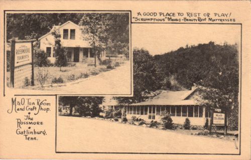 • The M & O Tea Room in Gatlinburg (postcard circa 1940) was a tearoom and craft shop that billed itself as "a good place to rest or play!" Like a lot of southerners, I grew up going to Gatlinburg, Tenn. on family vacations. For that reason, I was intrigued when I found this vintage postcard for the M & O Tea Room and Craft Shop and The Rossmore in Gatlinburg. The back of the card is blank, and I wasn't able to find out anything about this tearoom except that it was in operation around 1940 and some local weavers sold their wares here. Newer hotels had come along by the time I was a child visiting Gatlinburg, but I'll bet the M & O served many a happy tourist in the tearoom in its heyday.