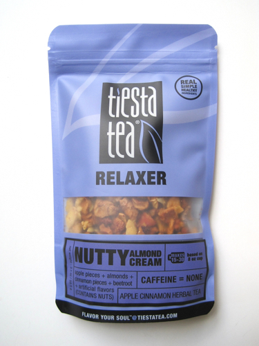 New tea packaging always catches my eye when I’m walking down the tea aisle in the grocery store. This week, Publix turned up a brand I’d not heard of before, Tiesta Tea. Several varieties looked intriguing, and I'll no doubt go back for the mango one soon (why didn't I just go ahead and get it?), but the "Relaxer" blend was singing to me.
