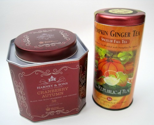 Karen in New York commented the other day that she likes to mix Harney's Cranberry Autumn Tea with their Cinnamon Spice Tea, and that is her go-to fall tea, of which she usually drinks at least a cup each day. I remembered her unique recipe when I was making some Cranberry and Pumpkin Spice Muffins this week, and it dawned on me, "What if I mixed cranberry- and pumpkin-flavored teas?"