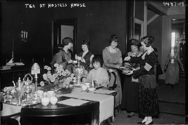 I have been pleased to discover that the Library of Congress updates the offerings in its collection of public-domain digital images on the web. This week, I came across one that was new to me, titled "Tea At Hostess House." The Library of Congress summary says, "Photograph shows women having tea at a 'hostess house' probably in a military camp during World War I. Hostess houses were set up by the War Work Council of the YWCA. (Source: Flickr Commons project, 2016)."