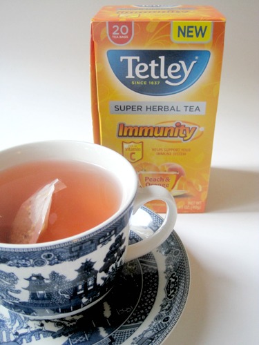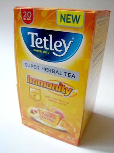 I stopped by Ingles in Bremen over the weekend and, as always, had to browse the tea aisle. New to me was a line of Tetley Super Herbal Teas, and after debating for a bit, I settled on the "Immunity" blend with Vitamin C, a peach-and-orange flavored tea.