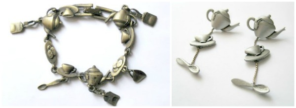 • Rhode Island is well known for its production of costume jewelry. When I first started collecting tea-themed jewelry, I was pleased to learn how much of it had been produced with teapots and teacups as part of the design. JJ or Jonette was a jewelry company in Providence, Rhode Island, that made both the bracelet and earrings above. The company's owners, the Lisker brothers, got the name by combining the name of their parents, John and Etta, thus the "Jonette" name. Rhode Island continues to be known for its jewelry manufacturing today.