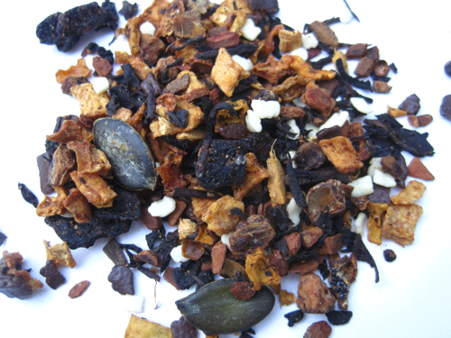 So exactly what all is in this tea? "Cinnamon, carob pieces, white chocolate pieces (sugar, cocoa butter, milk powder, dextrose), pumpkin pieces, chocolate flakes (sugar, cocoa mass, cocoa powder), oolong tea, natural flavor, ginger, chicory root, pumpkin seeds, cloves, allspice, nutmeg, coconut blossom sugar." (Everything but the kitchen sink, in other words.) The tea smelled divine when I opened the packet, and the taste?