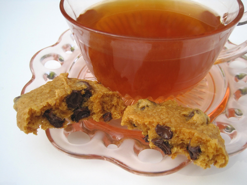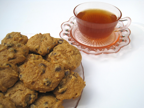 Oh, and I also used dark chocolate chips, because hey, if we're going for chocolate taste, go big or go home, right? These were wonderful with a cup of that new Pumpkin Spice Brûlée Oolong Tea I got from Teavana recently, and I was quite happy with my pumpkin-y teatime treat! Go here if you'd like to try these for yourself.