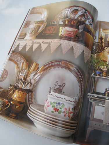 I also loved the feature on Wendy Addison, an artist whose work I first enjoyed in Victoria years ago. The banner made of old newsprint is typical of her style, which I fell in love with the moment I saw it. I also love how her silverware is displayed in pretty cream pitchers.