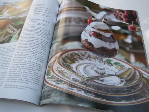 Even the recipes looked yummier surrounded by all this Christmas finery, such as this Black Forest Trifle displayed so charmingly on these Christmas dishes. Have you started planning for Christmas yet? Have you bought any Christmas magazines? I'd so enjoy hearing about them!