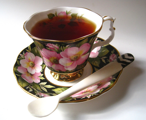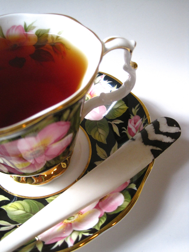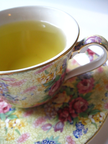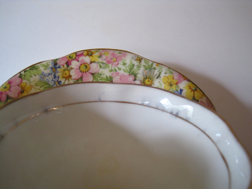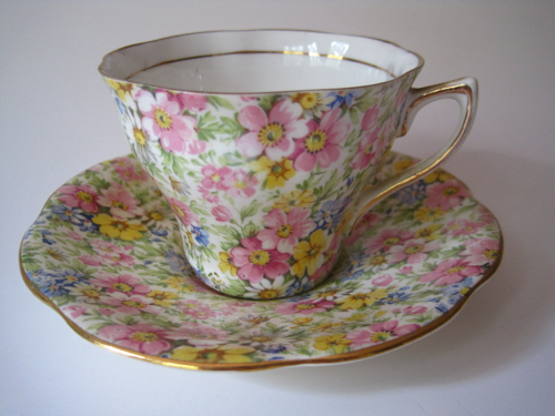 Some months ago, I mentioned finding my current favorite chintz teacup, this $3.33 find from one of the area Goodwill stores. It was stained in the bottom (and now it is again), but I bleached it out and it cleaned right up. But then …