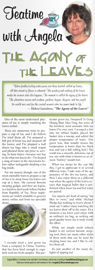 Yes, I know it's not quite September yet, but my September tea column in The Coweta Shopper actually comes out today, August 31. In case you have any computer issues reading this version, here's a link to The Coweta Shopper itself, and I'm on page 8. (Look for the plus and minus bar at lower left if you'd like to increase the display size — something I find myself dealing with more and more with each passing year!)