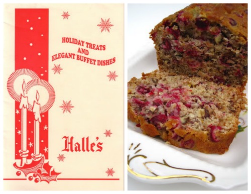 • One of the most delicious tea bread recipes you will ever find is from the old tearoom at the Halle Brothers Co., a department store in Cleveland, Ohio. I found this booklet of some of their holiday recipes a few years back, and now I make their Cranberry Bread every Christmas. Just looking at those fresh cranberries in the bread is making me hungry, so I may not wait until the holidays this year to bake another loaf! I first shared this recipe about five years ago, but here's the link for anyone who would like it.