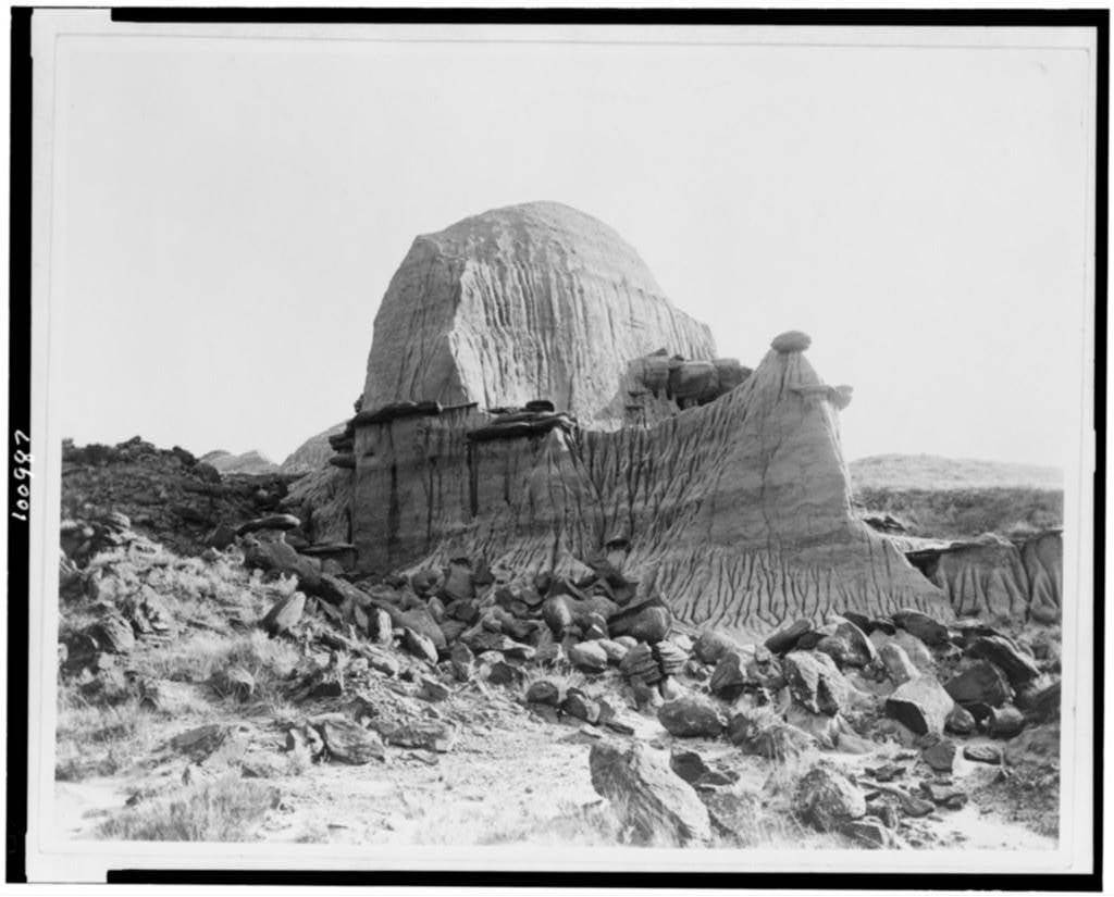 • Do you see a tea kettle here? As in, Tea Kettle Butte in Pyramid Park, North Dakota? This image from the Library of Congress website was said to have been taken sometime between 1909 and 1932 by photographer F. Jay Haynes. According to Webster's, a butte, pronounced “byüt," is "an isolated hill or mountain with steep or precipitous sides usu. having a smaller summit area than a mesa." I've seen the same image on a vintage postcard, and it was described as "a picturesque scene in the Bad Lands" of western North Dakota. No word on who decided this looked like a tea kettle. Or what they were sipping at the time …