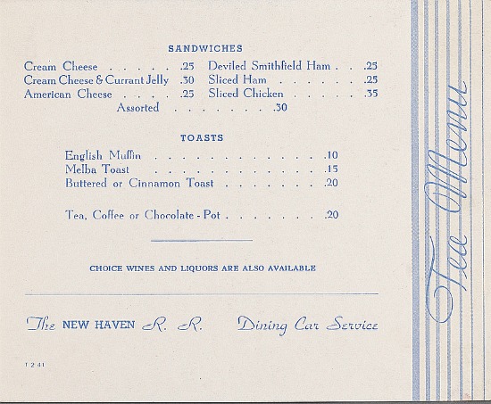 So I've found another interesting old menu on the New York Public Library's digital collections site. This one is a 1941 tea menu from the New Haven Rail Road. Look inside!