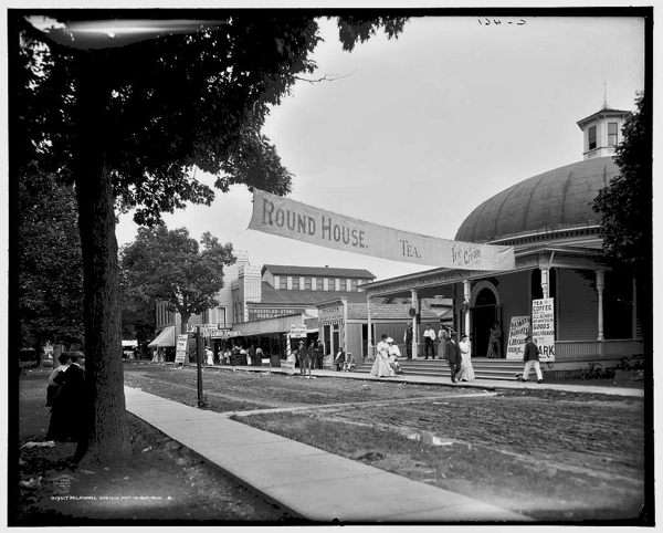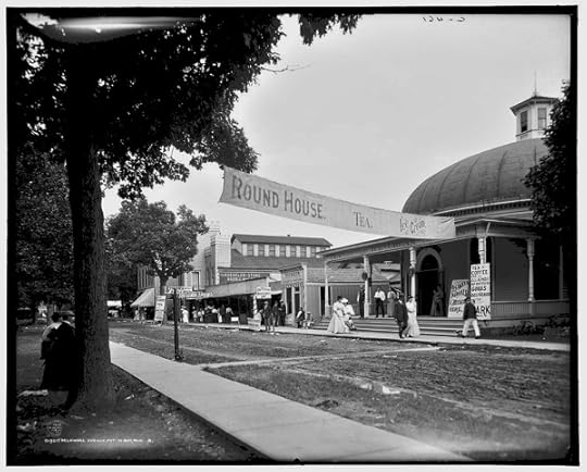 • Did you know a famous former tearoom in Ohio is now a bar? This 1906 photo is from Put-in-Bay, Ohio. The banner across the street advertises the Round House, Tea, and Ice Cream, and if you enlarge the photo (courtesy of the Library of Congress), that poster at far right says, "Tea, Coffee, and All Kinds of Bottled Goods Delivered in the Park." The Round House opened in 1873 as the Columbia Restaurant, was at some point a tea house, and is operated as a bar today. And tea friend Michele in Ohio knows right where this is located because it's the place where she grew up! I love it that even if I haven't been to some of these historic places in our nation's tea history, one of you probably has been.