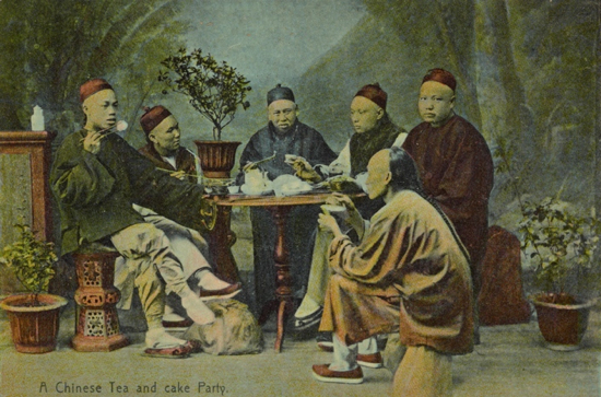 One of the tea-themed images I recently found on the New York Public Library website was this 1908 postcard titled "A Chinese Tea and cake Party." Do you find it interesting that the tea party attendees are all men? I do. It's not surprising that Chinese men are drinking tea, but it is surprising that this is called a "tea and cake party" and it's attended by men. I think it's highly possible the men wouldn't have labeled their gathering in this way!I always like to find that one person in a photo who looks like he wishes the photographer would go away, and that's pretty clearly the gentleman at far right.
