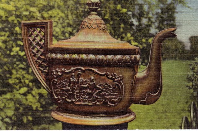 • This vintage postcard depicts a teapot that marks the site of the famous Edenton Tea Party in Edenton, N.C. Some courageous women led by a Penelope Barker vowed they would no longer “conform to ye pernicious Custom of Drinking Tea.” Some 51 women met on October 25, 1774 to protest the Tea Act passed by the British Parliament in 1773. They signed a petition vowing that they would give up their tea and boycott other British products "until such time that all acts which tend to enslave our Native country shall be repealed."