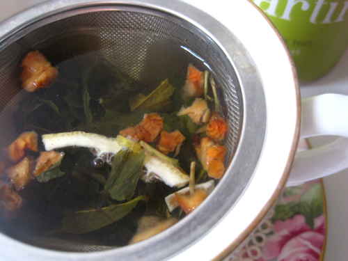 But since I happen to love ginger and lemon flavors, I suspected this herbal tea would be one I'd enjoy. It includes organic lemon grass, organic ginger, organic rose hips, and organic lemon myrtle. I love being able to see all of these individual bits in the loose blend.