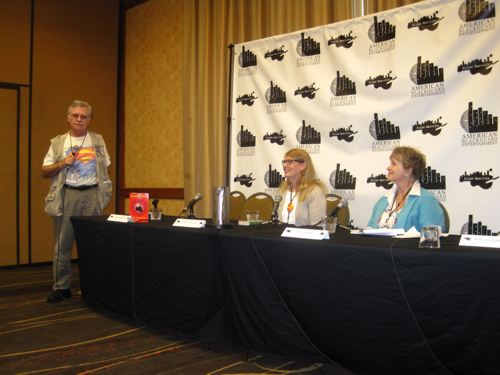 Since I'm polishing up the draft of my first cozy mystery, I was particularly interested in the cozy authors I came across, including Cheryl Hollon, center, who writes the "glass shop" cozy mystery series I've been hearing about, and another session (where my photos didn't turn out) featured Gail Oust, who writes the Spice Shop cozy mystery series I've also been hearing good things about.