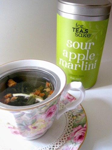 When I was at Plumyumi Day Spa last week, I was intrigued by the name of one tea in particular, the Sour Apple Martini blend. It's rather ironic since I'm a teetotaler (or tea-totaler, as I like to say), but I have always love-love-loved sour apple anything! When I commented that I was interested in this tea, the owner of the spa offered to brew me a cup on the spot, and I took him up on it. It was a wise move on his part, because after just one cup, I bought the largest tin they had before I left!