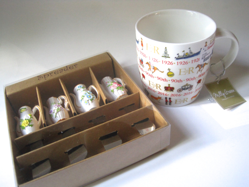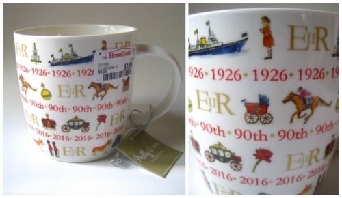 They had very few teacups, which was a surprise, but they had a great selection of tea mugs, including a cute one with teapots on it, but I resisted. Then, I got to the very-long-but-very-efficient checkout line, and that's where I spotted this Milly Green mug in honor of Queen Elizabeth's 90th birthday. I'm trying to downsize my china a bit and had told myself, "Self, no more tea mugs!" but a $3.99 royal commemorative? So, yeah. Had to.