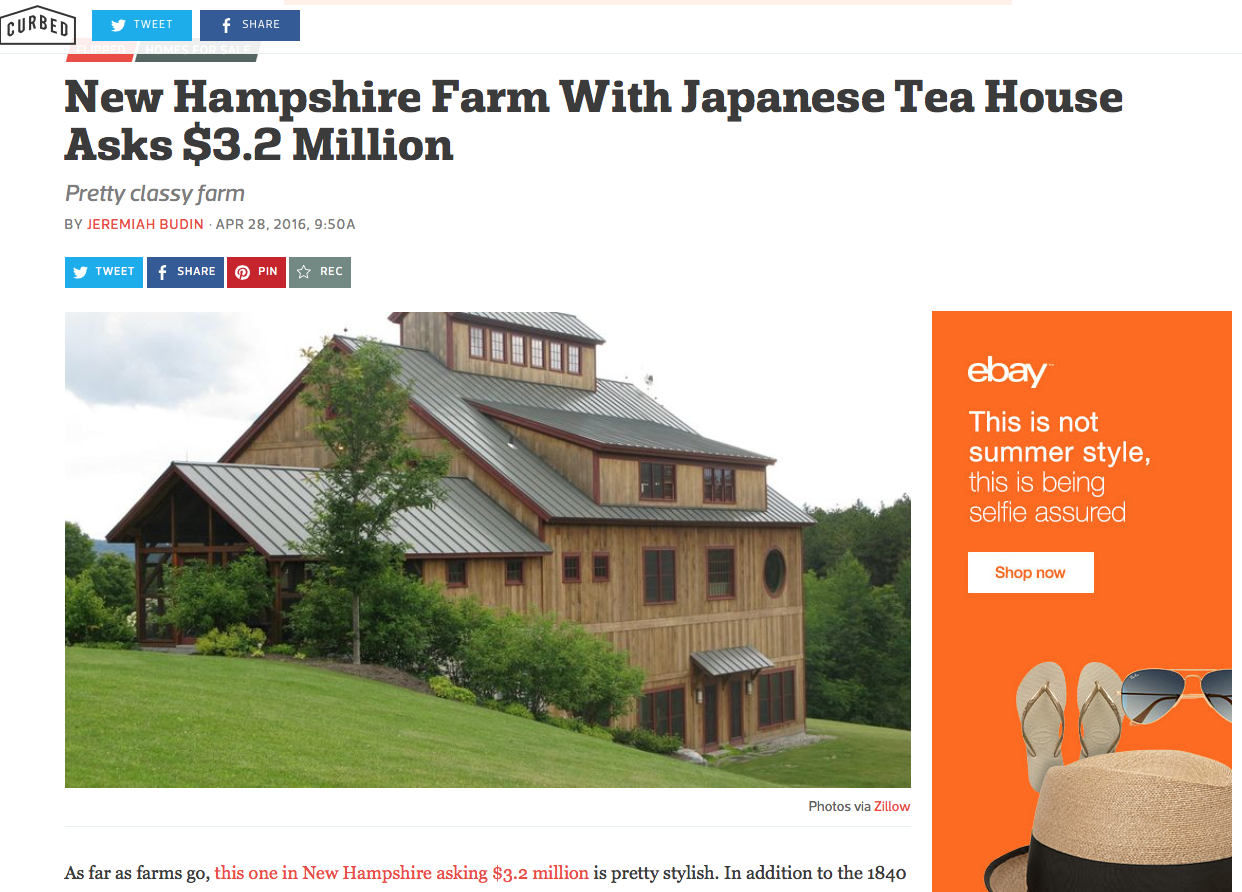 • Have a spare $3.2 million lying about? This New Hampshire farm with its own Japanese tea house could be yours! This screen grab from the website Curbed.com shows the farm, which comes with "a massive Japanese tea house, which, from the looks of things, is currently being used as a massive rec room." (Great news! I just did a search to see if the property is still available, and it is—and for only $2.95 million. Maybe we could all pitch in and open a tea-themed time-share?)