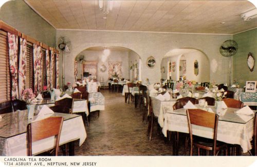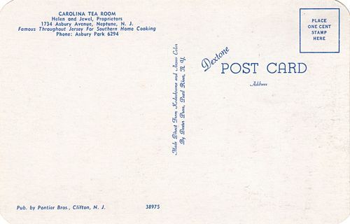• "CAROLINA TEA ROOM. Helen and Jewel, Proprietors. 1734 Asbury Avenue, Neptune, N.J. Famous Throughout Jersey For Southern Home Cooking." This is one of the postcards from my collection of vintage tearoom postcards, and I still find it intriguing that "Southern Home Cooking" was being offered in this tearoom. I also find it interesting that the top photo above shows tall electric fans on both sides of the tea room. That's something I picture us needing here in the hot South but not necessarily in New Jersey!