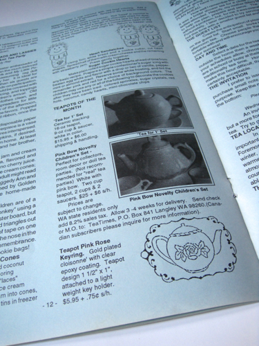 I had only one issue of this newsletter before Rose sent me the mother lode of TeaTimes Newsletter back issues, so my research capabilities have increased tremendously! In this February/March 1993 issue, which charmingly featured pale blue interior pages, I read a piece on "Teapots of the Month," which included a tea-for-one set and a Pink Bow Novelty Children's Set. How interesting that 23 years later, both styles are still favored today!