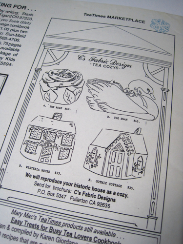 Even the old ads are fun to read! In this one, for "C's Fabric Design," the offer is for tea cozies and comes with the note that "we will reproduce your historic house as a cozy." Now how wonderful is that! As you can probably tell, I am having great fun going through these back issues Rose so generously shared with me, and I'll probably have more to say about them as I continue to pore over them in the days ahead!