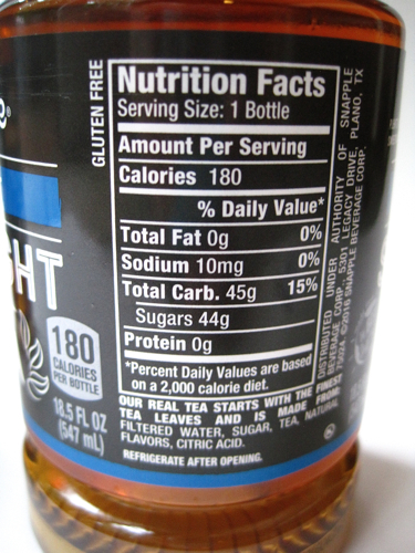 The Sweet tea? I'm sorry to say I didn't bother to read the labeling until I got home and had drunk half the bottle — or more than a Snickers bar's worth — of this tea. Ironically, I didn't think this sugar-laden beverage tasted that sweet, and goodness knows it should have, considering all the sugar. At home, I drink my iced tea unsweetened, and I do not miss the sugar. In fact, in iced tea or hot tea, I like to taste the flavor of my tea, not the sugar. I do, however, like to try all the new bottled teas for the sheer novelty of them. These disappointing Snapple drinks, however, are going on the been-there-done-that list and won't be repeat purchases. Do you usually drink your tea, hot or iced, sweetened? I'm betting that many of us do not, so I'd love to hear your thoughts!
