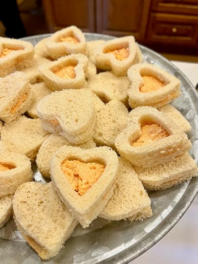 I like to use a cookie cutter to add cutouts to some of the sandwiches. That way, guests know at a glance that they're getting pimiento cheese. (I continue to use the Marilyn Miller Method of freezing the bread beforehand to make it easier to cut.)