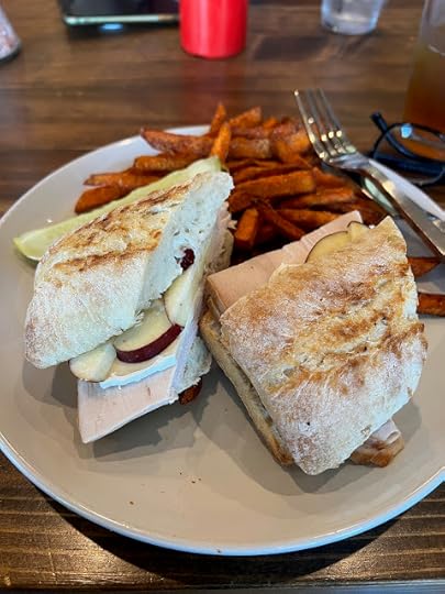 We always enjoy dining at the area restaurants, and at one of them, I enjoyed a Turkey Apple Brie sandwich with sweet potato fries and mango tea.