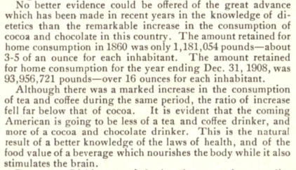 Health claims from food manufacturers are certainly nothing new, but these kind of cracked me up: "It is evident that the coming American is going to be less of a tea and coffee drinker, and more of a cocoa and chocolate drinker. This is the natural result of a better knowledge of the laws of health, and of the food value of a beverage which nourishes the body while it also stimulates the brain." If only!