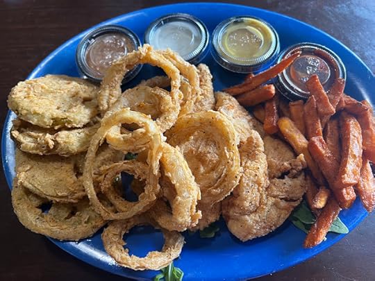 Both Tammy and I ordered those and the sampler platter, which featured fried green tomatoes, onion rings, chicken tenders, and sweet potato fries, all of which hit the spot. I took over half of mine home with me and have learned that such foods crisp up nicely in the toaster oven. So while the giant dehumidifiers continue to roar downstairs this week as my house dries out, at least I got to enjoy some fresh air and exercise on the Labor Day holiday itself!