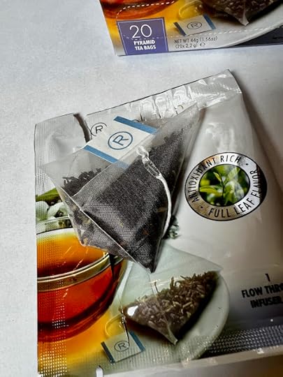 The tea in my teacup in Monday's post was this Earl Grey Lavender blend from Revolution Tea, a brand I first enjoyed many years ago. When I was introduced to this tea company, each tea bag was housed in a tiny little cardboard box that was maybe 1-1/2 inches wide and an inch tall. So when I saw this new box of their tea at Ollie's, I had to give it a try, especially at just $2.79 for the box of twenty pyramid tea bags.