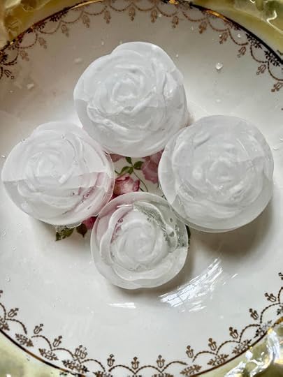 And here's the first batch of the rose ice cubes I made. Pretty, huh? But I have found that the water spreads unevenly, so you may have some really thick roses and then some like the one at the bottom that isn't as thick. I'd like them to be completely uniform, so I'll be trying again to adjust the water level so these all look the same. They didn't pop out of the tray quite as easily as I'd expected, either, but still … rose ice cubes, y'all!