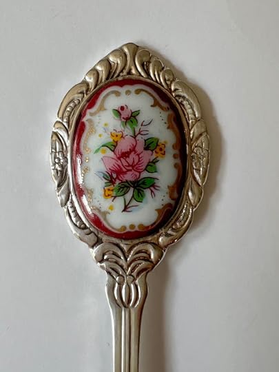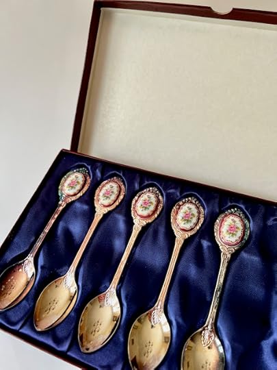 Last week, I enjoyed another hike with my old high school and college friend Tammy, and when I got in her car to head to the state park we were hiking, a burgundy box was waiting in the seat for me. She recently went to a “free estate sale” at the home of a friend, and she thoughtfully thought of me with a few gifts including this lovely boxed set of elegant porcelain-topped teaspoons! She apologized that only five remain, but as I told her, my favorite tea parties are for four guests, so this is perfect.