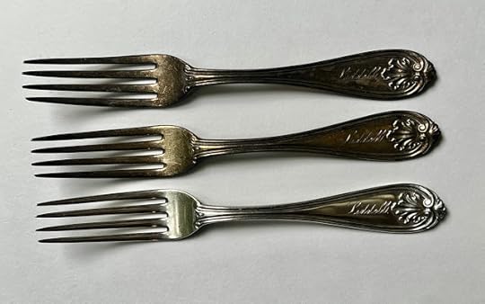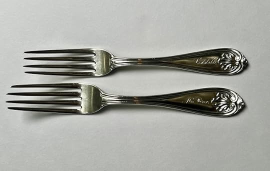 Then I remembered: Not long after we were married, Alex handed me a pillowcase, I believe it was, in which he'd wrapped a few silver pieces that belonged to his late mother. He said he thought I might like them, and indeed I did (and do). So now, I have four forks from his forebears—three of the seven-inch forks engraved "Liddell" and one 7-3/8-inch fork engraved "McRae." They're made of coin silver, which isn't quite as pure as sterling, but they all cleaned up beautifully with my beloved Wright's Silver Cream.