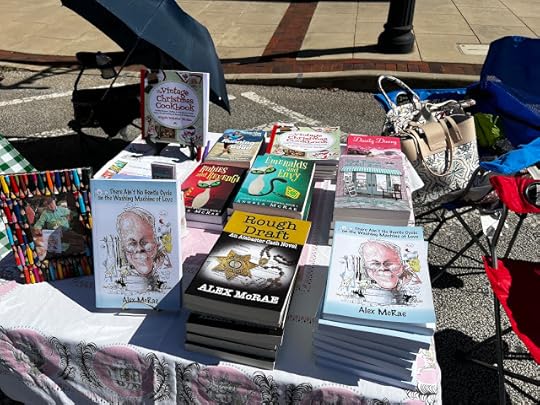 For some reason I couldn't explain, I felt compelled to head out thirty minutes early, which would have been way early except that my "low tire pressure" light came on just as I approached a local auto place that Alex and I always used. I slipped right in, and the tire wasn't just low but flat. Late on a Friday afternoon, they were quite busy, but the young man told me to pull my car in and he'd get it patched, and he did. I was out of there in thirty minutes, and he didn't even charge me. Isn't that interesting? (The Lord looks out for me!) So I got to my event and set up my little table in plenty of time. I had found some of Alex's books in his office and decided to take them, too, and was glad I did since two customers, like him, were Louisiana natives and wanted to read his novel. I was also pleasantly surprised that one young girl wanted both Emeralds and Envy and Rubies and Revenge and was eager for me to sign them. I'm always happy to find a new reader of cozy mysteries!